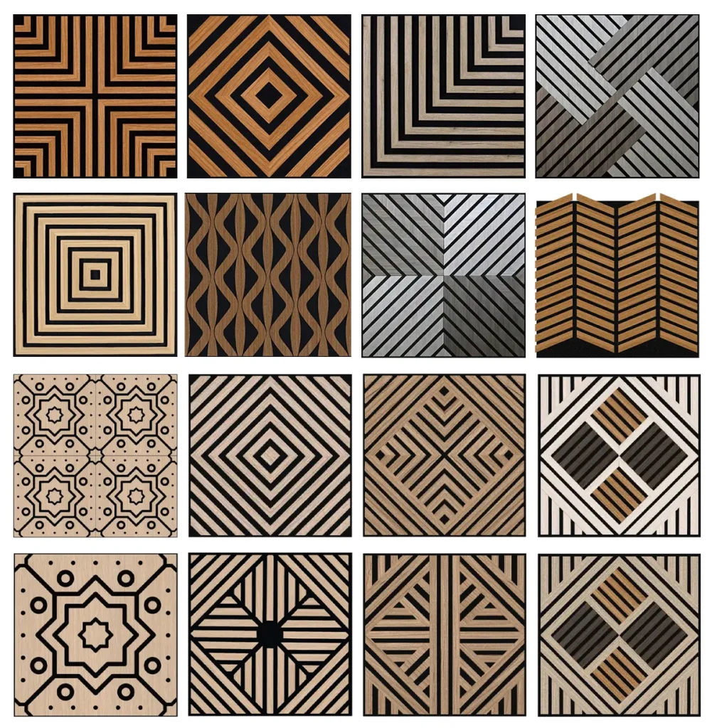 Integrated Acoustic Core: Each square panel incorporates a sound-absorbing substrate (e.g., recycled PET felt, mineral wool, or acoustic foam) behind a perforated or slotted wood face, allowing sound waves to enter and be trapped.