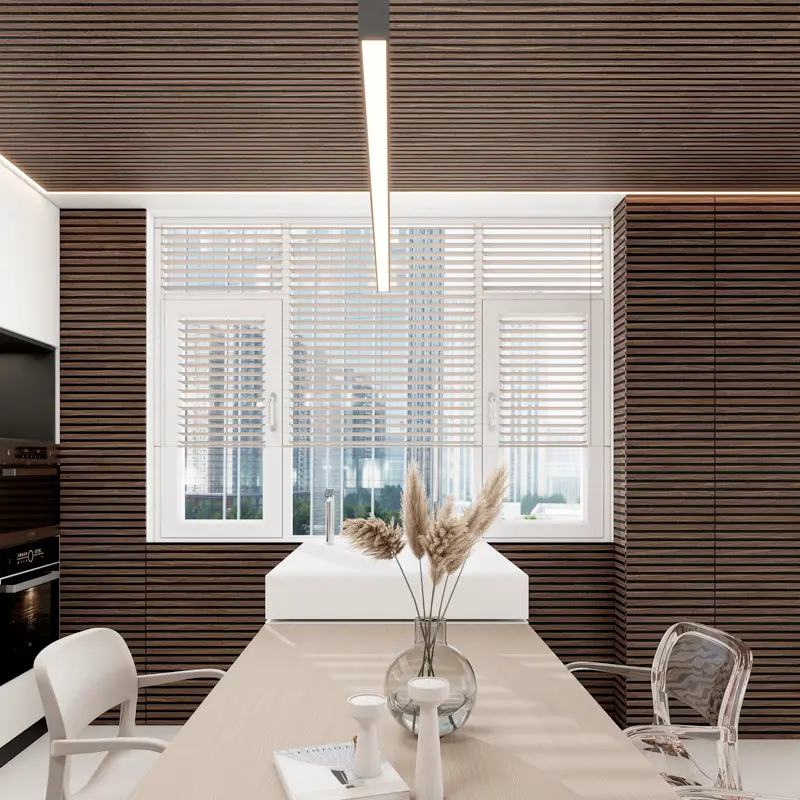 These strips, which can be either straight or curved, are made from MDF (medium-density fiberboard) or WPC (wood-plastic composite). The surface can be finished with technology wood veneer, natural wood veneer, or PVC film, offering a wide range of design options and textures to match various aesthetic preferences.