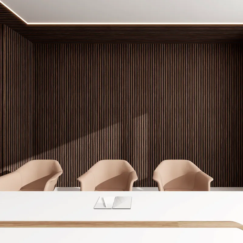 Integrated Acoustic Backing: The slats are mounted over a dense acoustic substrate (such as fiberglass or recycled felt), with precisely calculated gaps between slats that allow sound waves to penetrate and be absorbed.