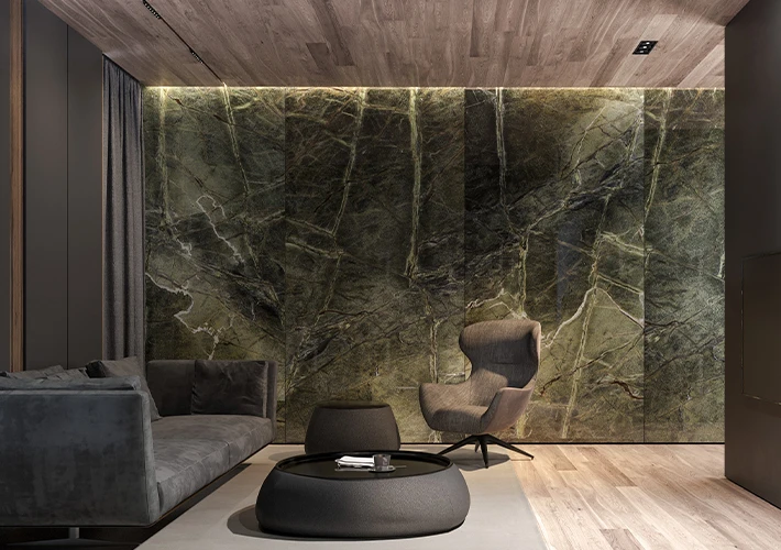 Dark PVC marble sheets require proper lighting to avoid dullness. Integrated lighting, wall washers, and backlit panels enhance depth and texture.