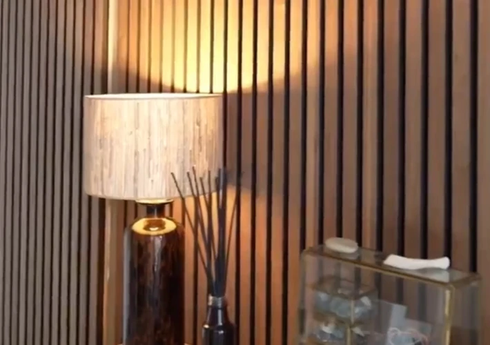 Premium homeowners are shifting from plain painted drywall to textured wood-acoustic finishes.